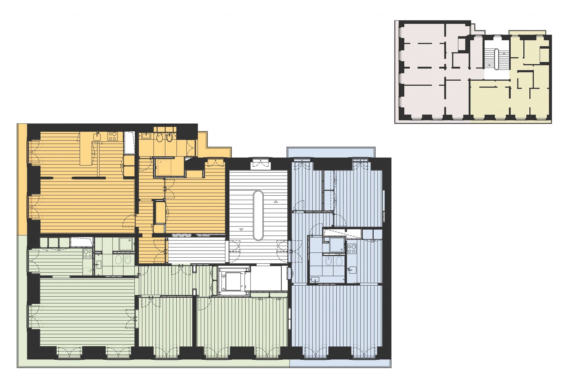 The intervention aimed for the adaptation and refurbishment of a “Pombalino” building, turning it into a short term rental unit. Located in the heart of the historical area of Baixa, in Lisbon, the building sits at the corner of Rua dos Fanqueiros and Rua da Conceição. Since its construction in the late 18th century, there has been a great deal of changes and modifications that deeply modified the original character of its fractions. As project strategy and as a way of reducing costs, the decision was made to accept its existing heterogeneous character. The intervention was defined as a new addition in continuity with its history, incorporating the changes of different times and setting aside a possible restoration process. The main actions determined by the project were: the typological change from two apartments per floor to three, the introduction of an elevator, the substitution of all infrastructures and the conservation of a substantial part of construction elements, such as floor boards, the wooden ceilings in overlapping boards, internal and external tiles, window frames and doors. The trim needed and the “patches” were considered as such.