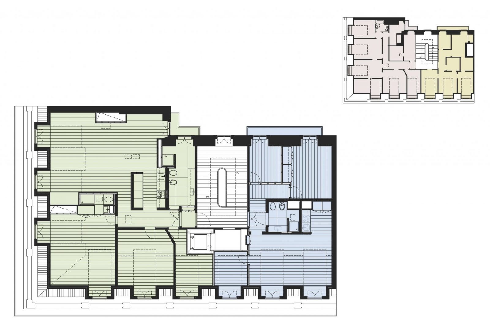 The intervention aimed for the adaptation and refurbishment of a “Pombalino” building, turning it into a short term rental unit. Located in the heart of the historical area of Baixa, in Lisbon, the building sits at the corner of Rua dos Fanqueiros and Rua da Conceição. Since its construction in the late 18th century, there has been a great deal of changes and modifications that deeply modified the original character of its fractions. As project strategy and as a way of reducing costs, the decision was made to accept its existing heterogeneous character. The intervention was defined as a new addition in continuity with its history, incorporating the changes of different times and setting aside a possible restoration process. The main actions determined by the project were: the typological change from two apartments per floor to three, the introduction of an elevator, the substitution of all infrastructures and the conservation of a substantial part of construction elements, such as floor boards, the wooden ceilings in overlapping boards, internal and external tiles, window frames and doors. The trim needed and the “patches” were considered as such.